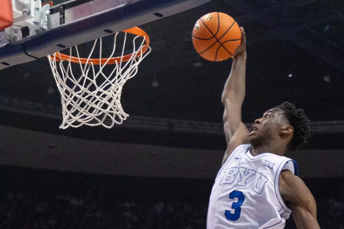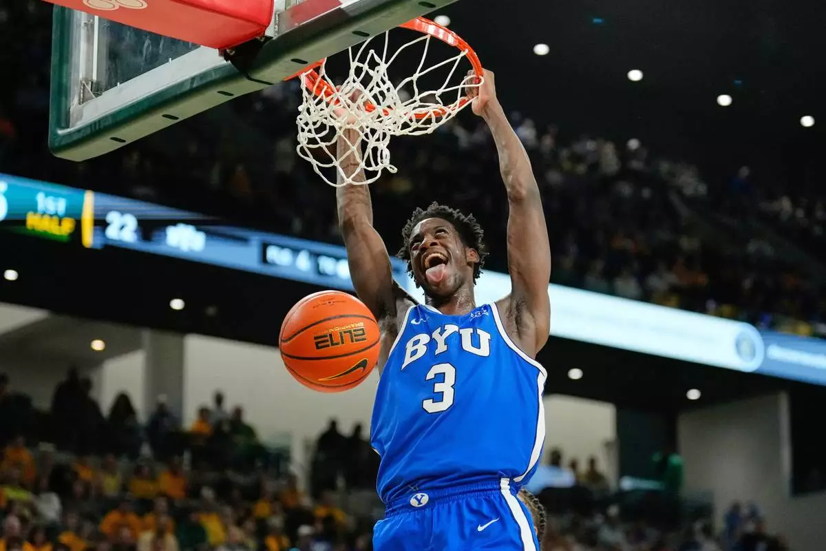 FILE - BYU forward AJ Dybantsa dunks in the first half of an NCAA college basketball game against Baylor Tuesday, Feb. 10, 2026, in Waco, Texas. (AP Photo/Tony Gutierrez, File