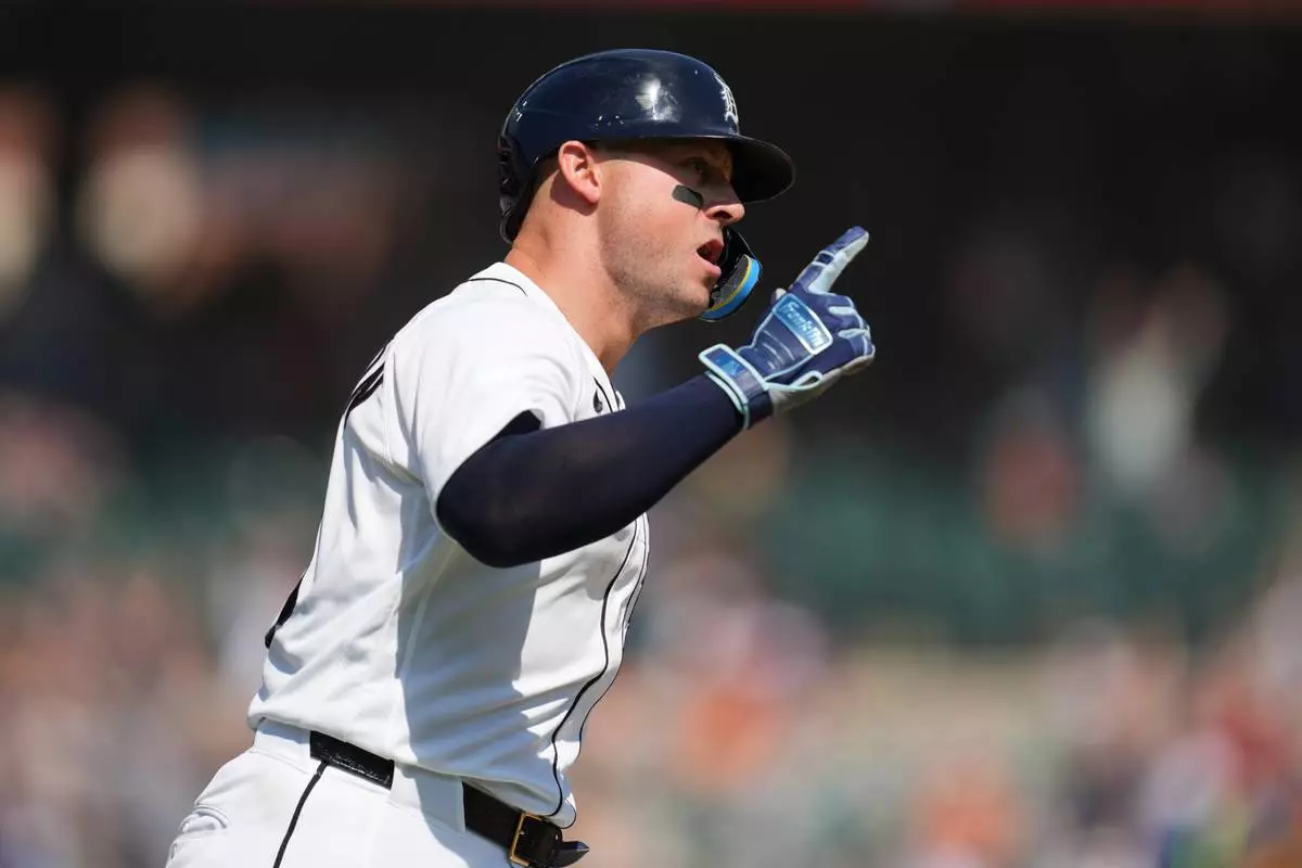 Detroit Tigers' Spencer Torkelson reacts to his walk off home run against the Milwaukee Brewers during the ninth inning of a baseball game Thursday, April 23, 2026, in Detroit. (AP Photo/Paul Sancya)