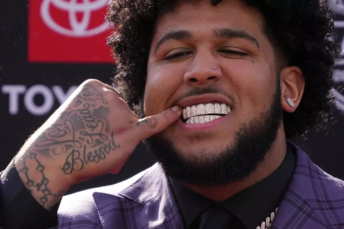 Alabama offensive lineman Kadyn Proctor shows off his dental jewelry while posing on the red carpet before the first round of the NFL football draft in Pittsburgh, Thursday, April 23, 2026. (AP Photo/Gene J. Puskar)