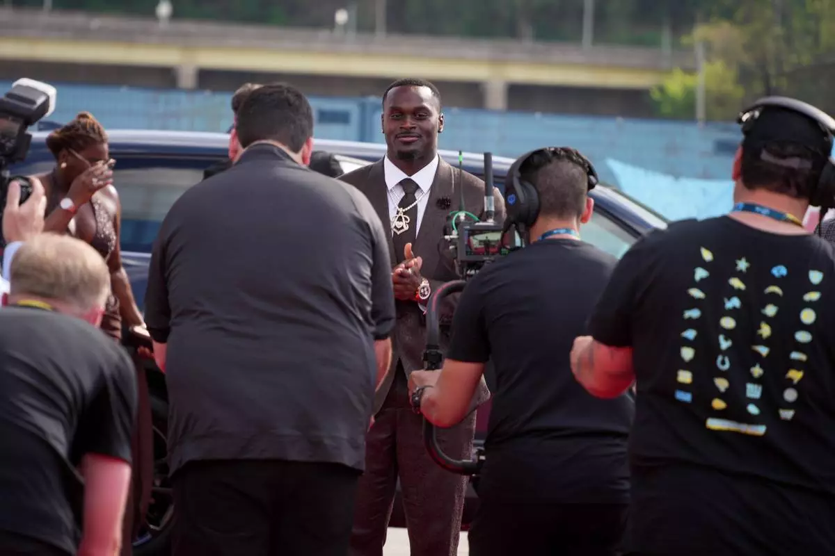 Notre Dame running back Jeremiyah Love arrives on the red carpet before the first round of the NFL football draft, Thursday, April 23, 2026, in Pittsburgh. (AP Photo/Gene J. Puskar)