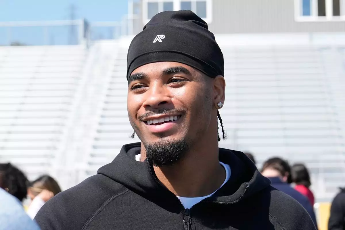 Mansoor Delane, LSU defensive back, is interviewed after the NFL's annual prospect clinic ahead of the NFL football draft Wednesday,April 22, 2026, in Pittsburgh. (AP Photo/Sue Ogrocki)