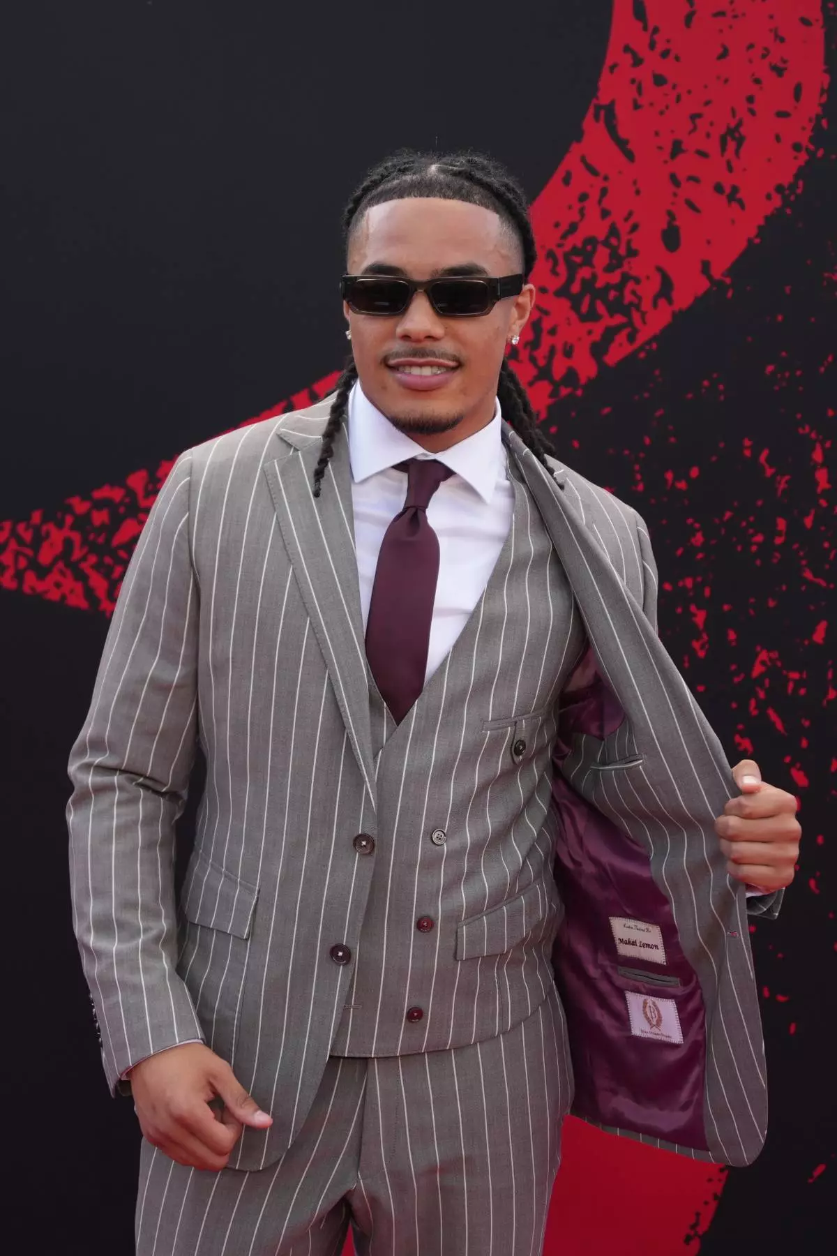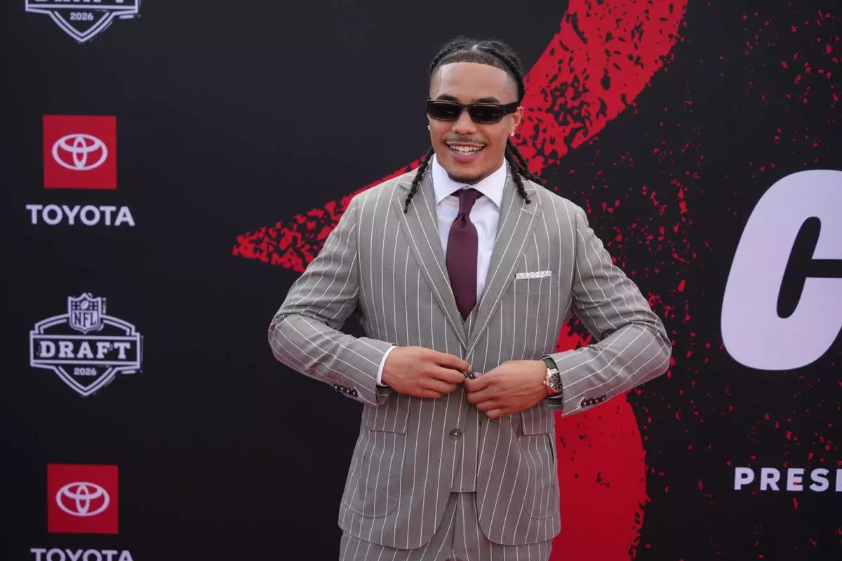 Southern California wide receiver Makai Lemon poses on the red carpet before the first round of the NFL football draft, Thursday, April 23, 2026, in Pittsburgh. (AP Photo/Gene J. Puskar)