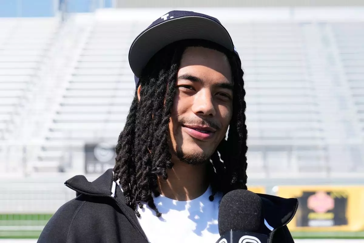 Makai Lemon, USA wide receiver, is interviewed after the NFL's annual prospect clinic ahead of the NFL football draft Wednesday,April 22, 2026, in Pittsburgh. (AP Photo/Sue Ogrocki)