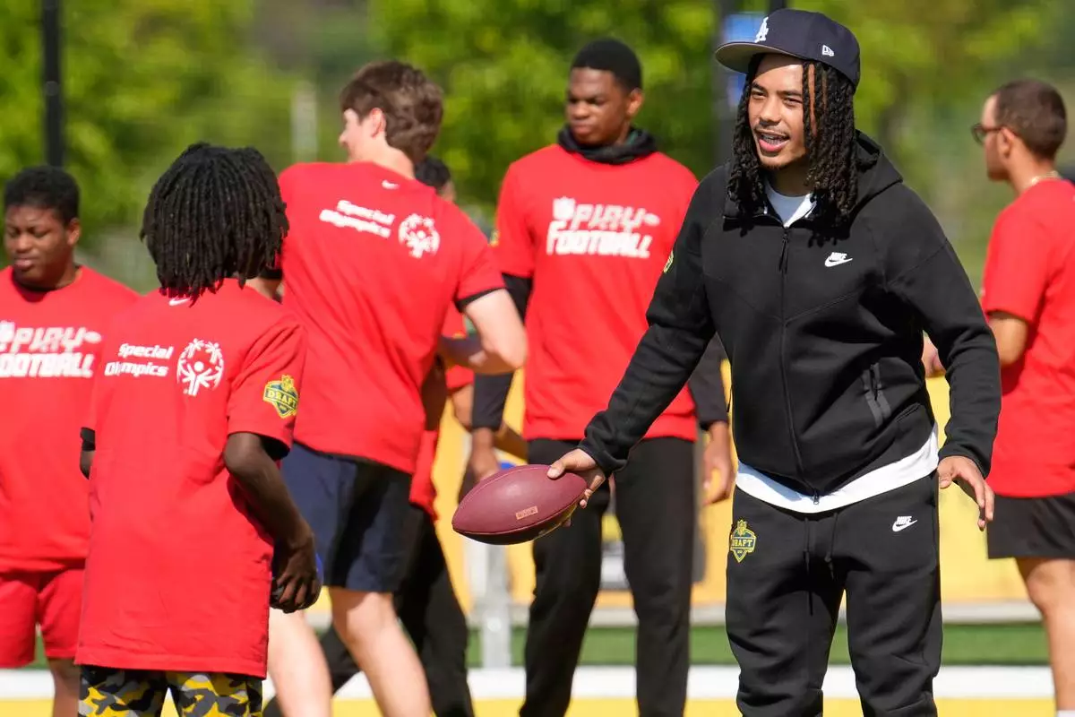 Makai Lemon, USC wide receiver, works with local youth football players and Special Olympics athletes during the league's annual prospect clinic ahead of the NFL football draft Wednesday,April 22, 2026, in Pittsburgh. (AP Photo/Sue Ogrocki)