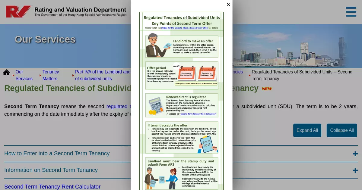 The RVD reminds that pursuant to the Ordinance, a regulated cycle of regulated tenancies is to comprise two consecutive regulated tenancies (i.e. the first-term tenancy and second-term tenancy) for an SDU, and the term of each regulated tenancy is two years. A tenant of a first-term tenancy for an SDU is entitled to be granted a second-term tenancy of the regulated cycle, thus enjoying a total of four years of security of tenure. The RVD has been issuing letters enclosing relevant information to the landlords and tenants concerned of regulated tenancies in batches, according to the expiry time of their first-term tenancies, to assist them in understanding the important matters pertaining to the second-term tenancy, and to remind them about the procedures that need to be followed about two months prior to the commencement of the purported second-term tenancy as well as their respective obligations and rights under the Ordinance. These landlords and tenants may also visit the dedicated page for the second-term tenancy on the RVD's website (www.rvd.gov.hk/en/tenancy_matters/second_term_tenancy.html) for the relevant information, including a concise guide, brochures, tutorial videos and frequently asked questions. The landlords and tenants concerned are also advised to familiarise themselves with the relevant statutory requirements and maintain close communication regarding the second-term tenancy for handling the matters properly and in a timely manner according to the Ordinance.