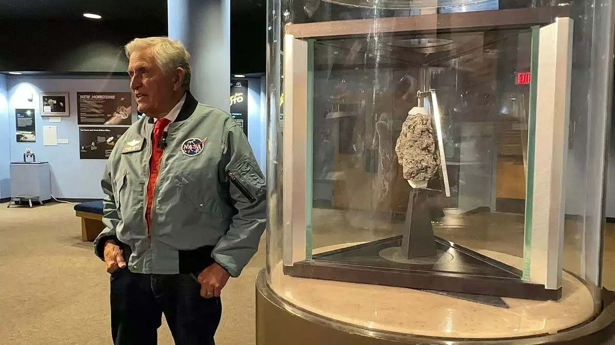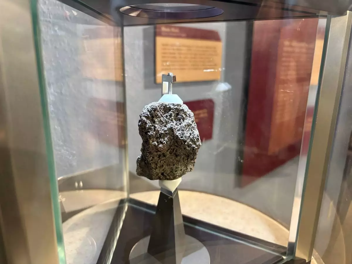 A moon rock collected by Apollo astronaut Harrison "Jack" Schmitt in 1972 is displayed at the New Mexico Museum of Natural History and Science in Albuquerque, N.M., on April 22, 2026. (AP Photo/Susan Montoya Bryan)