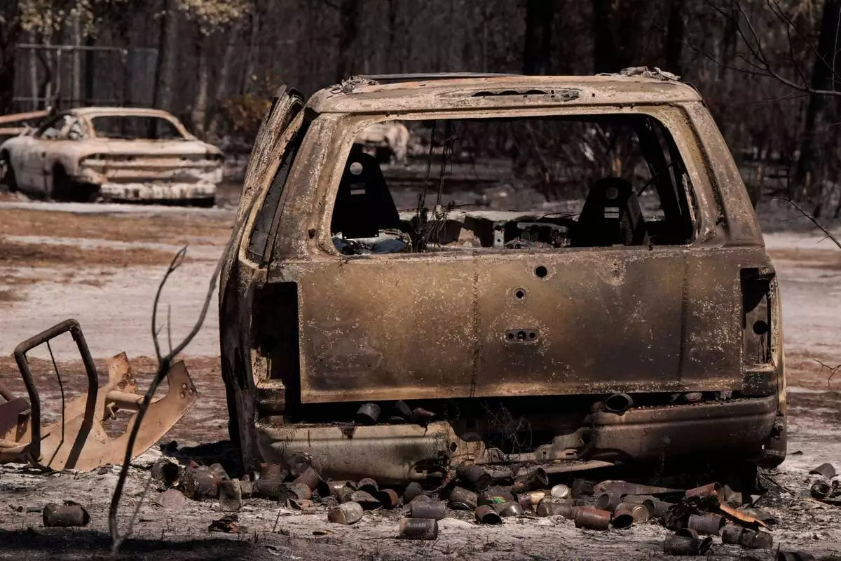 A burned vehicle sits near a destroyed home as the Brantley Highway 82 fire burns, Thursday, April 23, 2026, near Nahunta, Ga. (AP Photo/Mike Stewart)