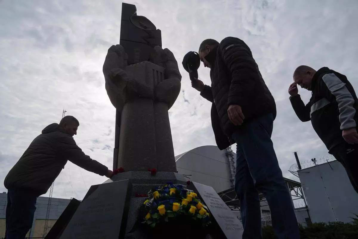 Workers sent to help clean up the effects of the 1986 Chernobyl nuclear power plant accident, place flowers at a monument in front of the facility, Tuesday, April 21, 2026, in Chernobyl, Ukraine. (AP Photo/Evgeniy Maloletka)