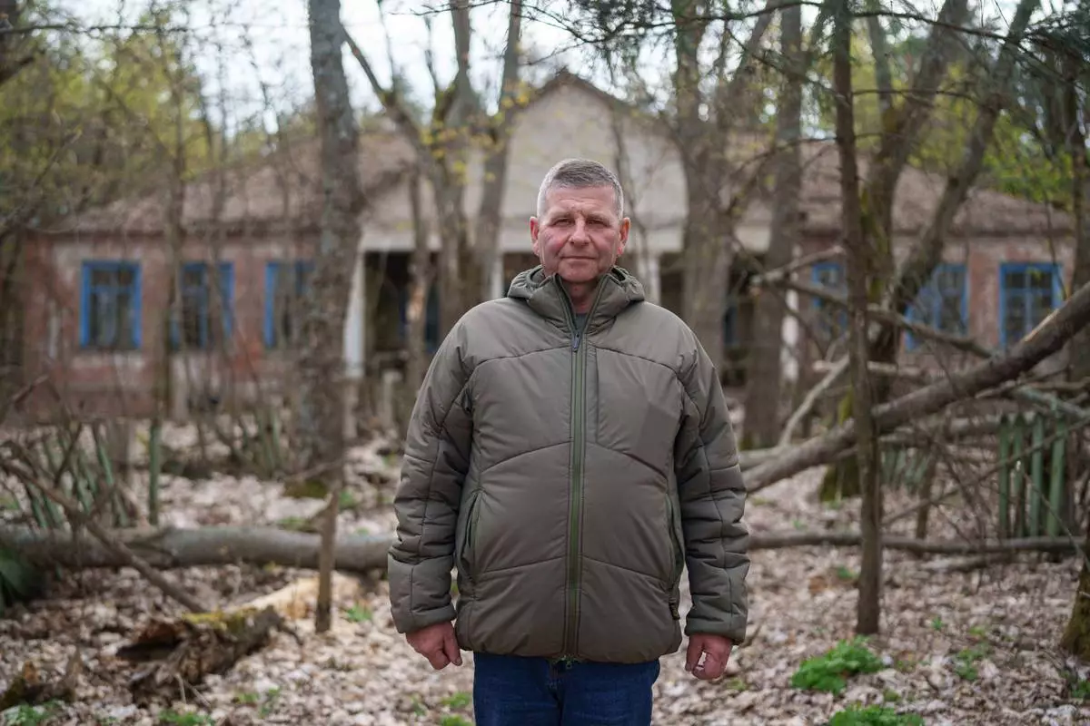 Serhii Buriak, 60, who helped guard abandoned buildings after the 1986 Chernobyl nuclear accident, poses for a portrait near the plant in Chernobyl, Ukraine, Tuesday, April 21, 2026. (AP Photo/Evgeniy Maloletka)