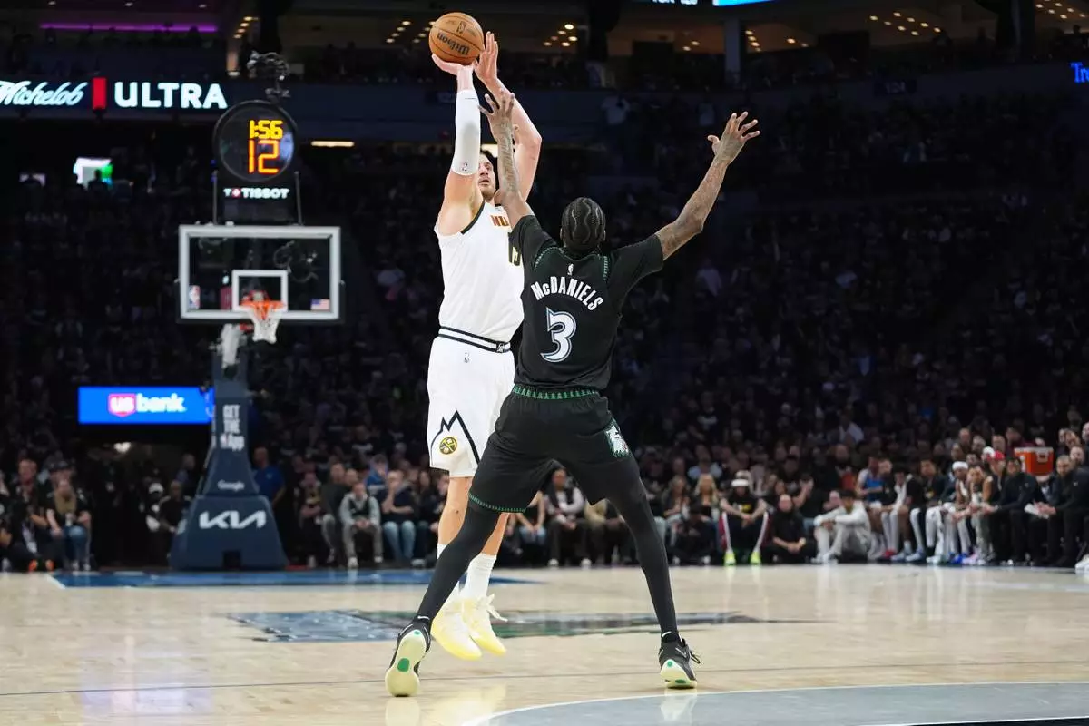 Denver Nuggets center Nikola Jokic (15) shoots over Minnesota Timberwolves forward Jaden McDaniels (3) during the first half in Game 3 of a first-round NBA basketball playoff series, Thursday, April 23, 2026, in Minneapolis. (AP Photo/Abbie Parr)