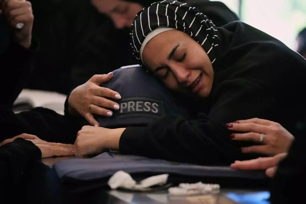 Zainab, the sister of Lebanese journalist Amal Khalil, who was killed on Wednesday in an Israeli airstrike, hugs her helmet as she mourns over her coffin in the village of Baysariyeh, southern Lebanon, Thursday, April 23, 2026. (AP Photo/Mohammed Zaatari)