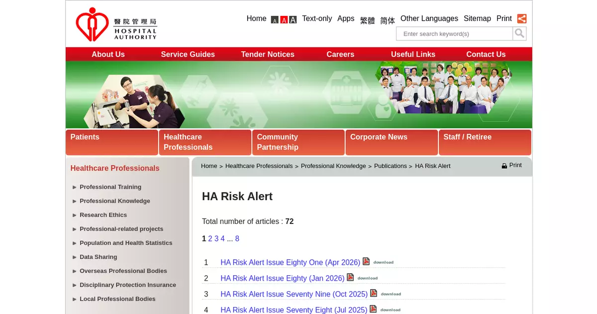 The HA Head Office has released the latest "HA Risk Alert" to all staff. It can also be accessed by the public at www.ha.org.hk/riskalert. "HA Risk Alert" is published on a quarterly basis and posted on the HA website in January, April, July and October. The next issue is scheduled for July 2026.