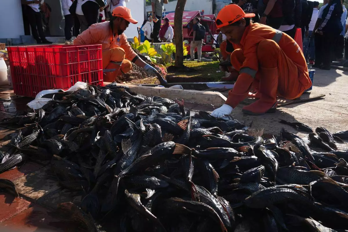 The cleanup on Friday at a 6-meter-deep (19-foot-deep) reservoir in East Jakarta’s Ciracas neighborhood drew curious crowds as city workers collected about 320 kilograms (705 pounds) of the fish.