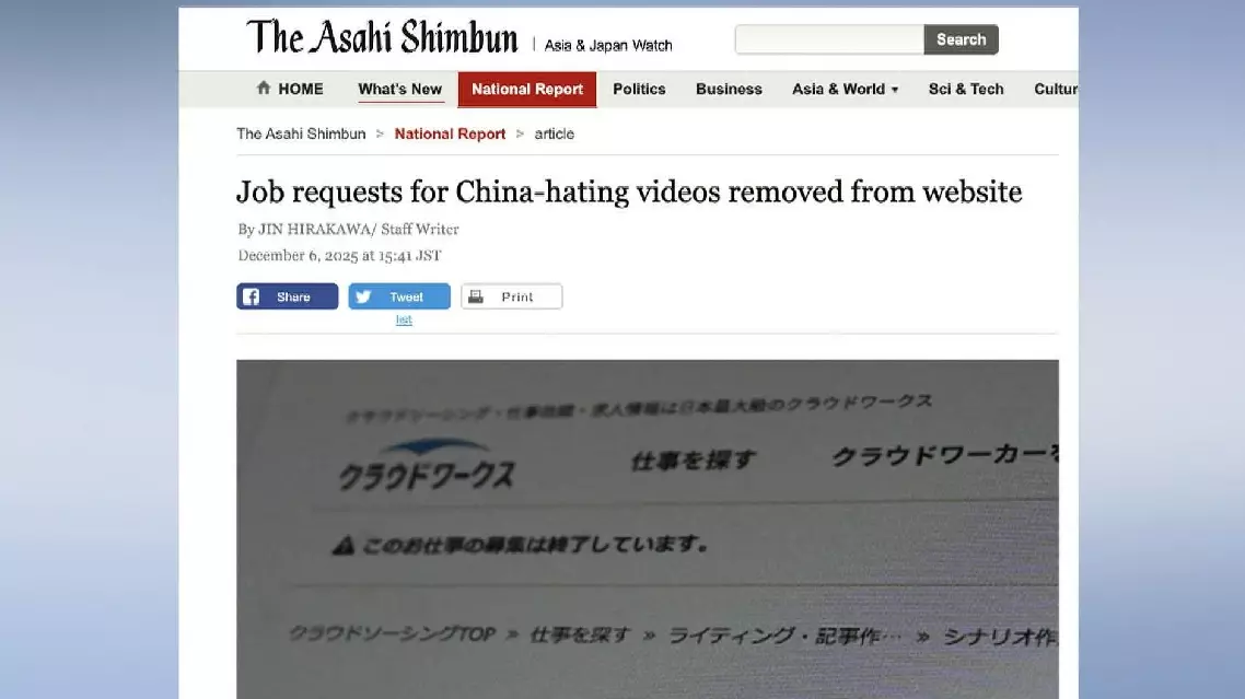 According to the report, Japanese video creators take orders via freelance platforms to produce fictional scripts depicting so-called "disruptive behaviors" of the Chinese people that end in self-inflicted consequences, with detailed operational guidelines provided.