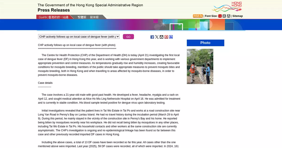 From April 17 to yesterday (April 23), the CHP recorded three imported DF cases and one local DF case announced earlier. Of the three imported cases, two patients had travelled to Malaysia and one to Vietnam during the incubation period. Hong Kong has recorded 16 DF cases so far this year, including 15 imported cases and one local case. A total of 59 DF cases were recorded last year (2025), all of which were imported cases. In 2024, 161 DF cases were recorded, including 156 imported cases and five local cases.