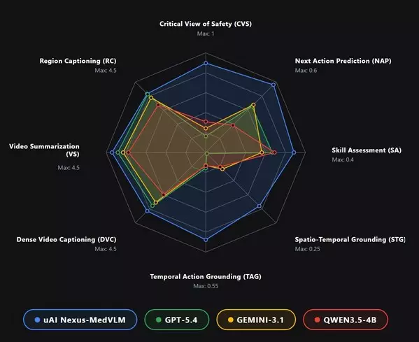 With only 4B/7B parameters, uAI NEXUS MedVLM significantly outperforms leading general-purpose foundation models, including GPT-5.4 and Gemini 3.1, across key medical video tasks. It achieves 89.4% accuracy in surgical safety assessment, compared to GPT-5.4 (1.8%) and Gemini 3.1 (10.1%). In spatio-temporal action localization, it delivers up to 14× higher mIoU than GPT-5.4 and 4× higher than Gemini 3.1. For video report generation, it scores 4.2 out of 5, substantially surpassing GPT-5.4 (2.5) and Gemini 3.1 (2.4).