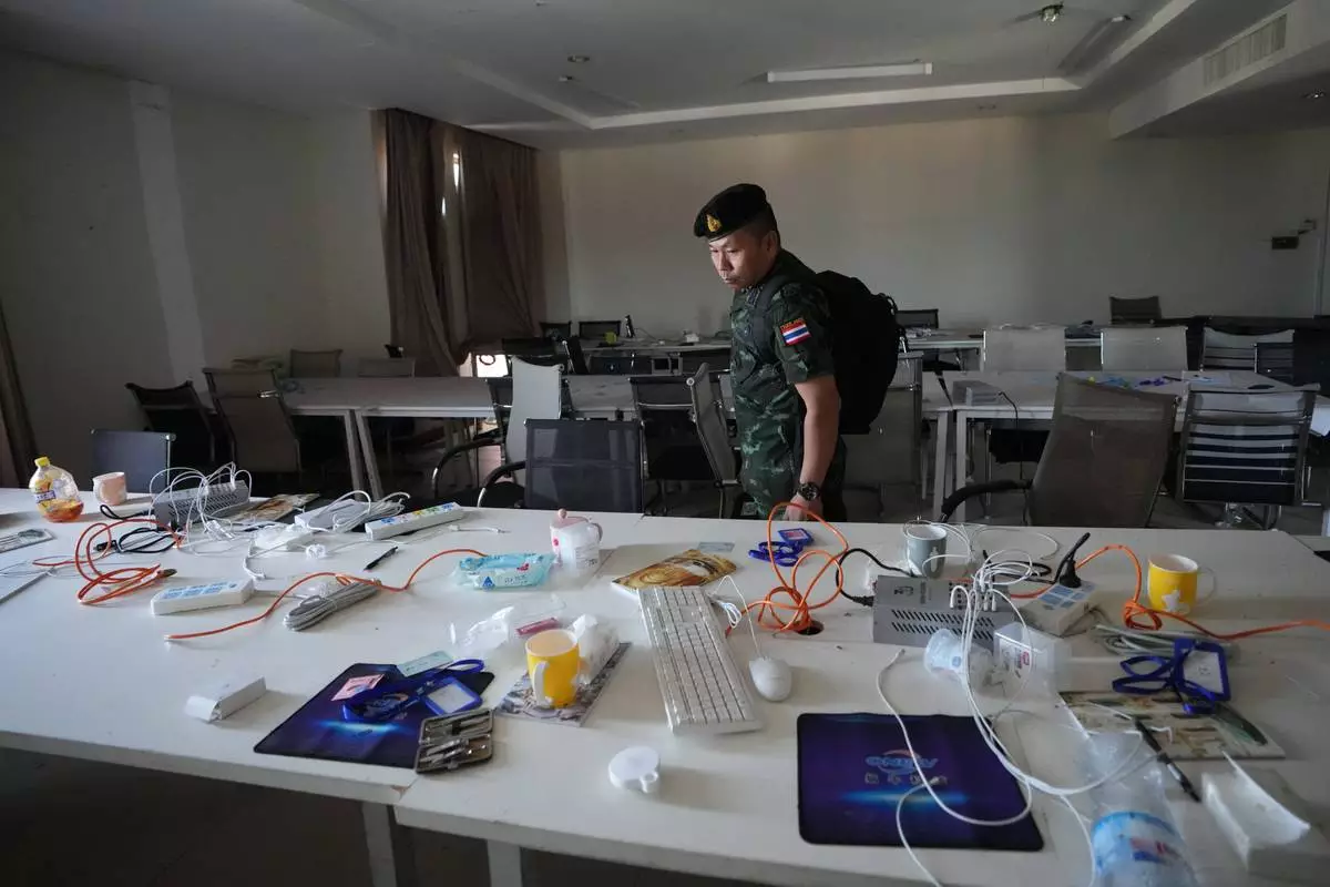 FILE -A Thai solider inspects a work station inside a scam center in O'Smach, Cambodia, Feb. 2, 2026, (AP Photo/Sakchai Lalit), File)