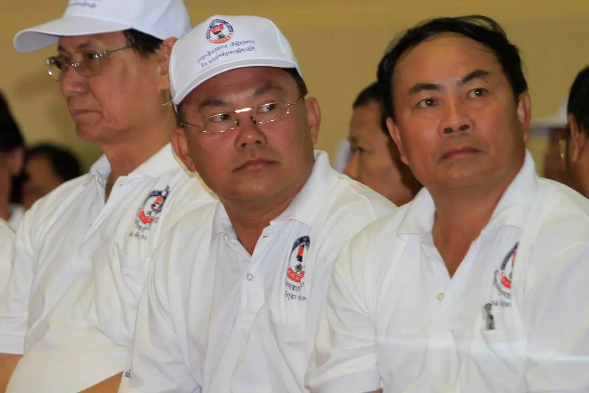 FILE -Cambodian tycoons, Senator Kok An, right, Ly Yong Phat, second from right, Lao Meng Khin, center, sit as they attend a ceremony to mark International Anti-Drug Day in Phnom Penh Cambodia, T, June 26, 2012. (AP Photo/Heng Sinith, File)