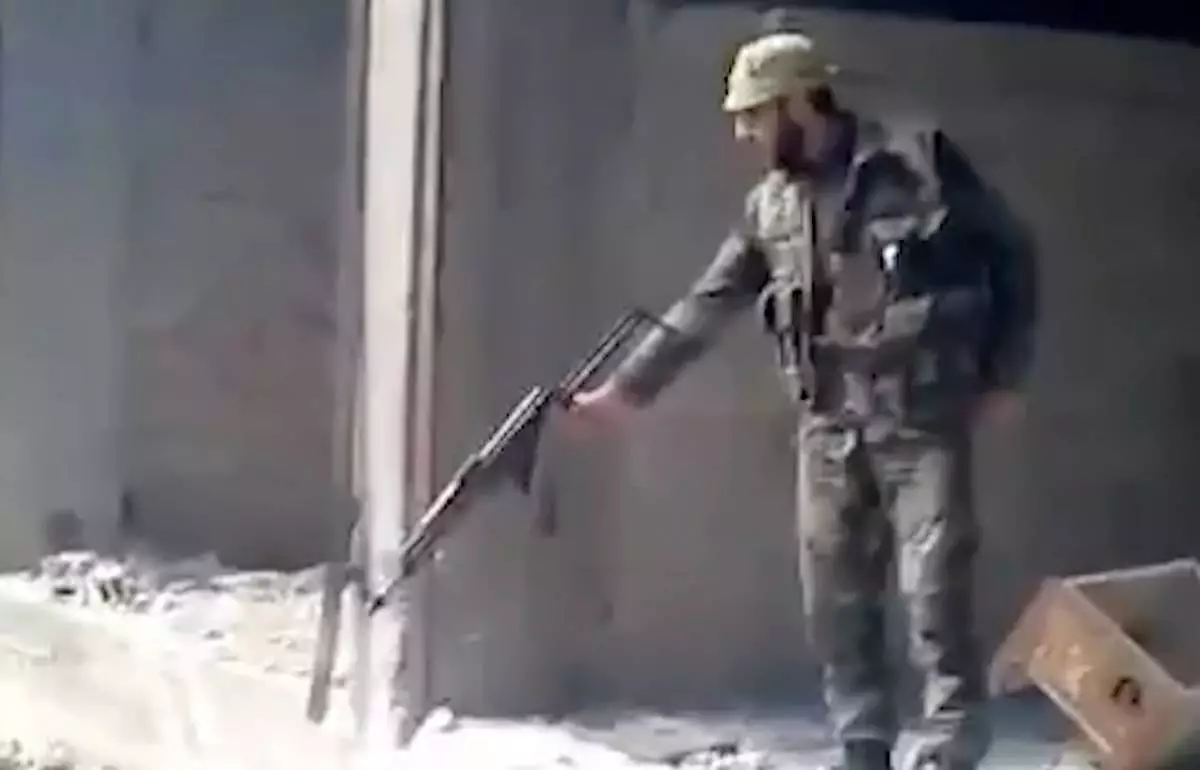 FILE - This frame grab from a 2013 video, shows a Syrian soldier firing into a large pit full of bodies, in the Tadamon neighborhood of Damascus, Syria. (AP Photo, File)