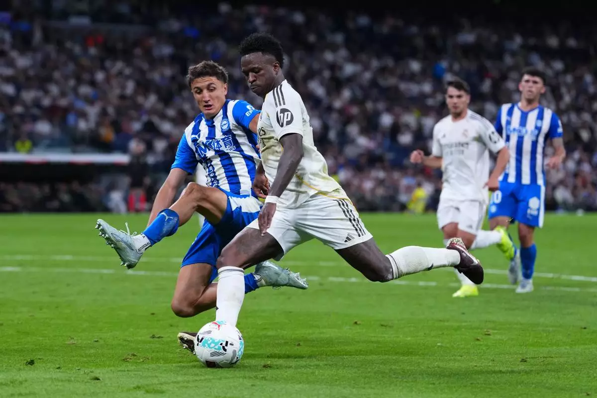 FILE - Alaves' Nahuel Tenaglia tries to block Real Madrid's Vinicius Junior during a La Liga soccer match between Real Madrid and Alaves in Madrid, Spain, Tuesday, April 21, 2026. (AP Photo/Manu Fernandez, File)