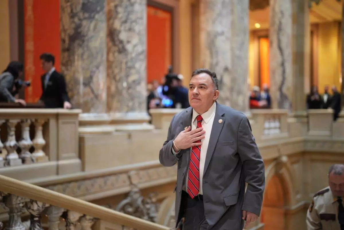 FILE - State Sen. John Hoffman climbs the stairs at the Minnesota State Capitol in St. Paul, Minn., Feb. 17, 2026, the first day of the 2026 legislative session. (Alex Kormann/Star Tribune via AP, File)