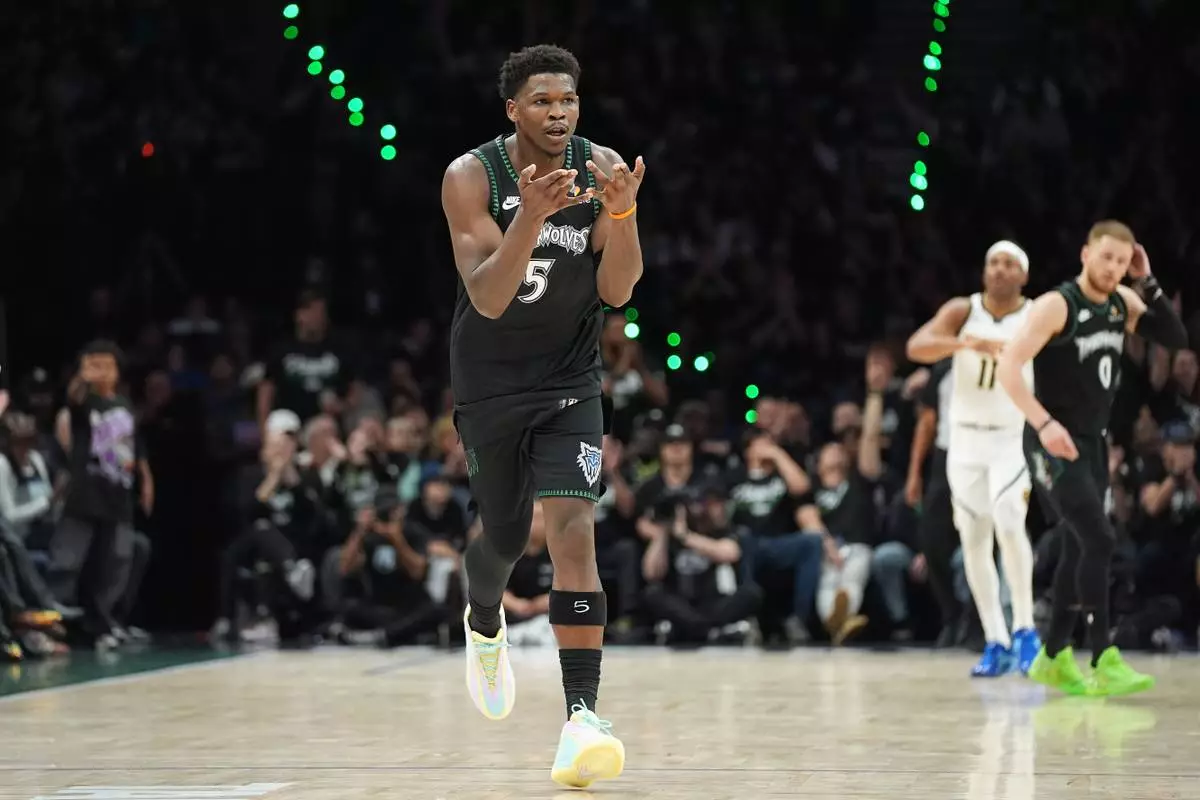Minnesota Timberwolves guard Anthony Edwards (5) celebrates after making a 3-point shot during the first half in Game 3 of a first-round NBA basketball playoff series against the Denver Nuggets, Thursday, April 23, 2026, in Minneapolis. (AP Photo/Abbie Parr)