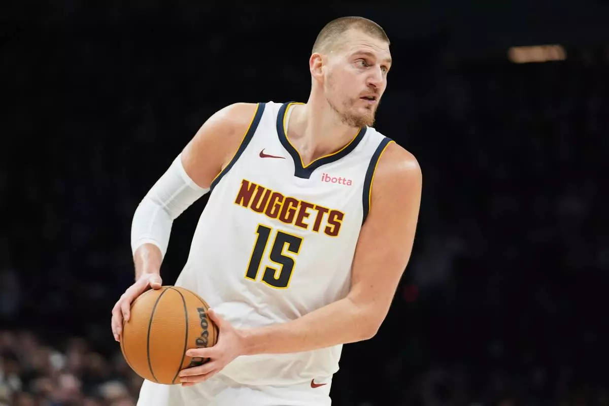 Denver Nuggets center Nikola Jokic (15) handles the ball during the first half in Game 3 of a first-round NBA basketball playoff series against the Minnesota Timberwolves, Thursday, April 23, 2026, in Minneapolis. (AP Photo/Abbie Parr)