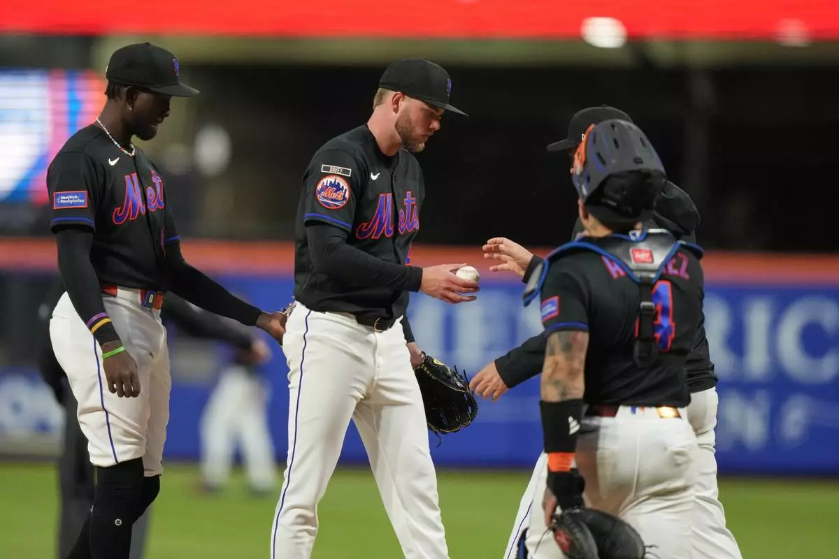 New York Mets starting pitcher Christian Scott, center, leaves during the second inning of a baseball game against the Minnesota Twins Thursday, April 23, 2026, in New York. (AP Photo/Frank Franklin II)