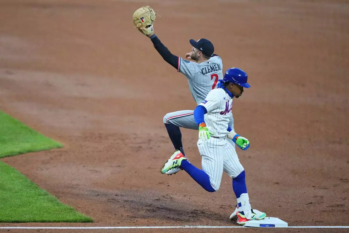 New York Mets' Francisco Lindor (12) runs past Minnesota Twins' Kody Clemens (2) to reach first base for a single during the first inning of a baseball game Wednesday, April 22, 2026, in New York. (AP Photo/Frank Franklin II)