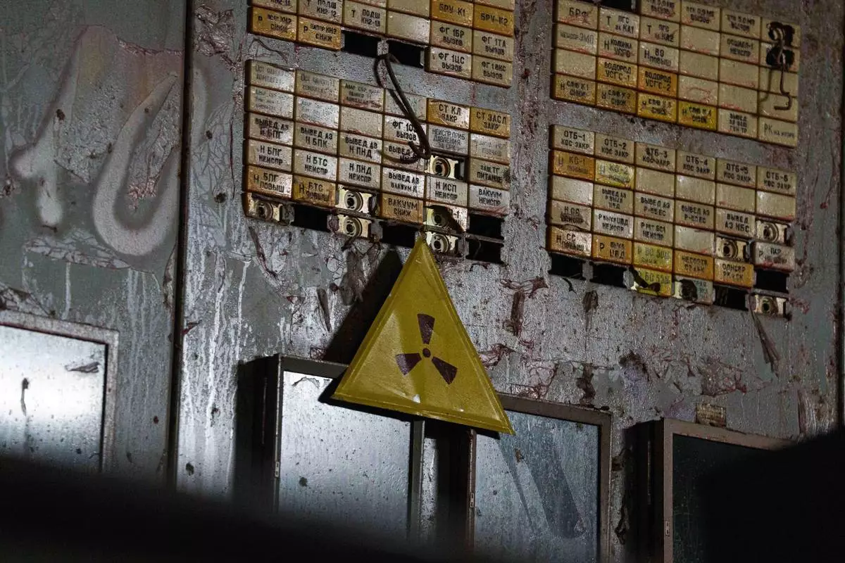 A radiation warning sign is seen on April 6, 2026, in the control room for Reactor No. 4 that exploded and burned in 1986 at the Chernobyl nuclear power plant in Ukraine. (AP Photo/Evgeniy Maloletka)