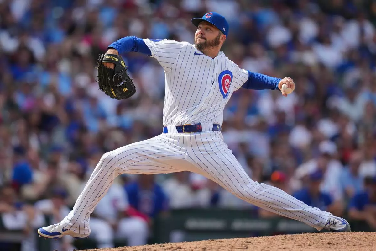 Chicago Cubs pitcher Caleb Thielbar (24) throws against the Philadelphia Phillies during the ninth inning of a baseball game Thursday, April 23, 2026, in Chicago. (AP Photo/Erin Hooley)