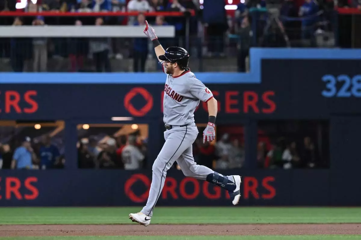 Cleveland Guardians' Daniel Schneemann (10) runs the bases after hitting a solo home run against the Toronto Blue Jays in first inning of a baseball game in Toronto on Friday, April 24, 2026. (Jon Blacker/The Canadian Press via AP)