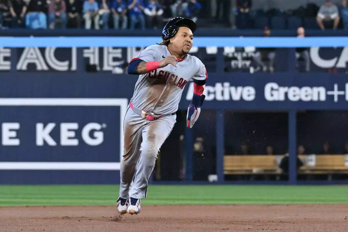 Cleveland Guardians' Jose Ramirez runs to third base during first-inning baseball game action against the Toronto Blue Jays in Toronto, Friday, April 24, 2026. (Jon Blacker/The Canadian Press via AP)