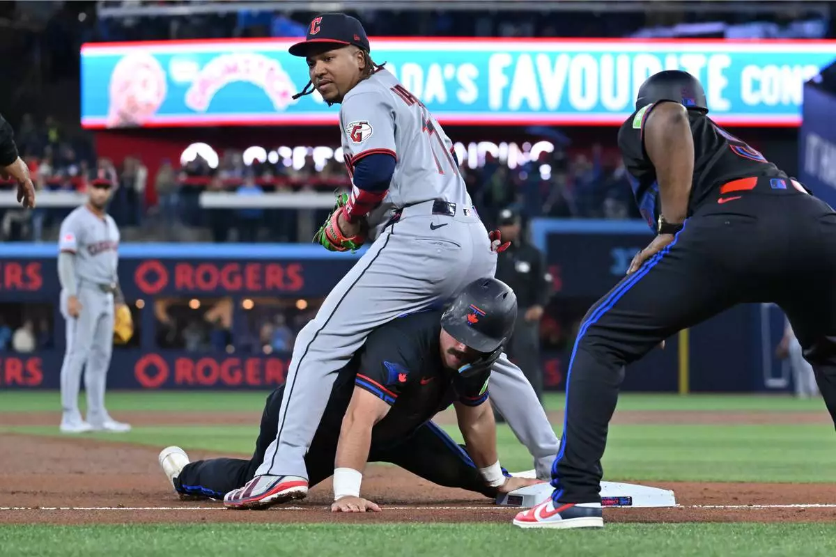 Toronto Blue Jays' Davis Schneider (bottom) slides safely into third base ahead of a tag by Cleveland Guardians third baseman Jose Ramirez (11) in first inning of a baseball game in Toronto on Friday, April 24, 2026. (Jon Blacker/The Canadian Press via AP)