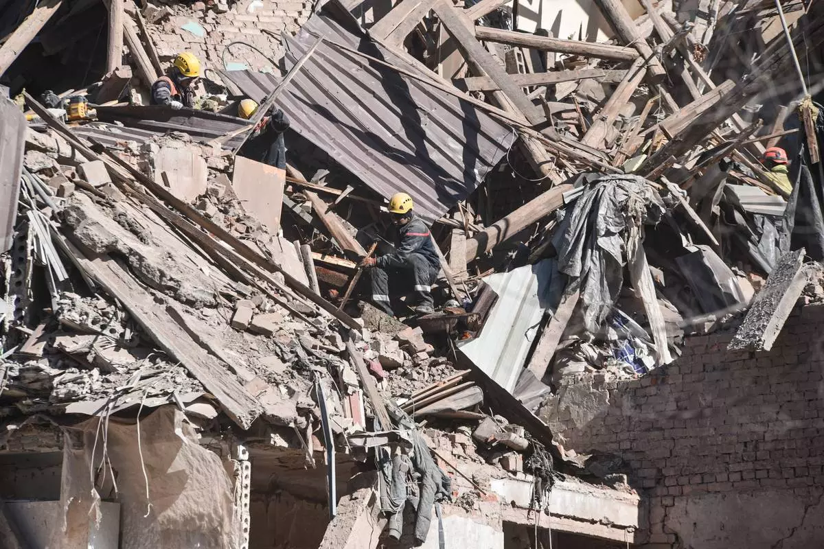 Rescue workers clear the rubble of a residential building destroyed by a Russian strike, in Dnipro, Ukraine, Saturday, April 25, 2026. (AP Photo/Mykola Synelnykov)