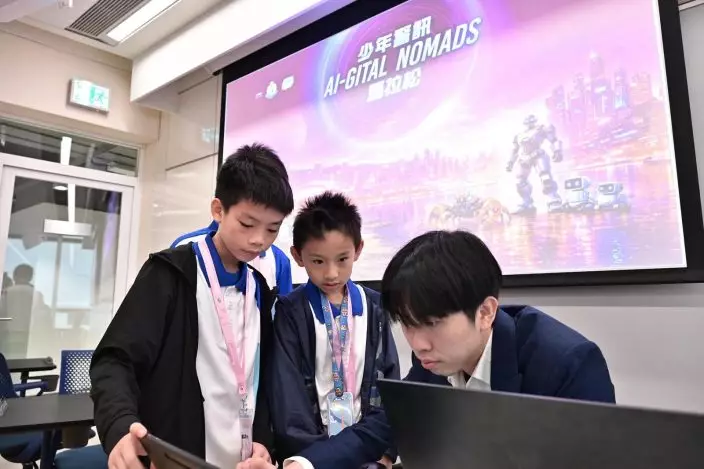 The Junior Police Call of the Hong Kong Police Force, together with the Hong Kong Baptist University, held the AI-GITAL NOMADS Scheme cum Award Presentation Ceremony today (April 25). Photo shows a competing team of the primary school section participating in the hackathon under the guidance of an industry expert, applying the AI skills learned in previous courses to design four-panel comics, showcasing their creativity. Source: HKSAR Government Press Releases