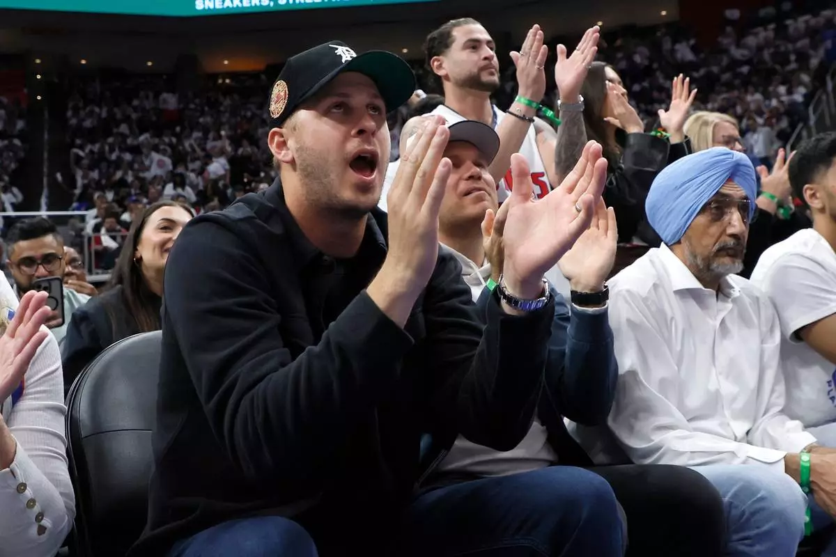 Detroit Lions quarterback Jared Goff cheers on the Detroit Piston during the second half in Game 2 of a first-round NBA basketball playoffs series against the Orlando Magic Wednesday, April 22, 2026, in Detroit. (AP Photo/Duane Burleson)