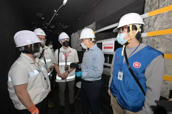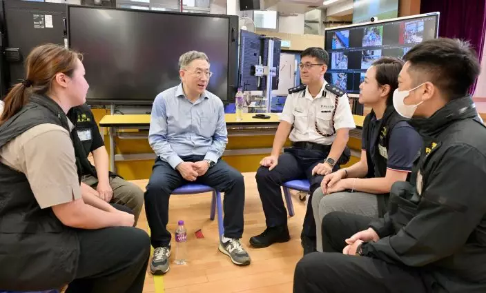 The Deputy Chief Secretary for Administration, Mr Cheuk Wing-hing, today (April 25) inspected the arrangements for residents of Wang Fuk Court in Tai Po returning to their units. Over the past few days, the District Crime Squad of Tai Po District has been handling requests from residents for police assistance. They briefed Mr Cheuk on how these cases were handled, including their efforts to help residents sift through the rubble and ashes to recover their property. Mr Cheuk said that the Police have done an excellent job in assisting residents in retrieving their items over the past few days, and encouraged them to continue with the follow-up work to safeguard residents' property. The Police place great emphasis on the arrangements for residents of Wang Fuk Court to return to their flats, and have been fully engaged in the cross-departmental operation from start to finish. Their roles include crowd management at the registration centre; traffic management in the vicinity of Wang Fuk Court; accompanying residents to and from their flats and in and out of their units; deploying officers to stand guard at the main lobby of the building and on the open floors; forming quick response teams to attend to residents who may feel unwell during their return; assisting in the opening of safes inside the flats; and helping residents move their belongings, including providing physical support when necessary. Photo shows Mr Cheuk (second left) learning more from members of the District Crime Squad of Tai Po District handling requests from residents for police assistance. Source: HKSAR Government Press Releases