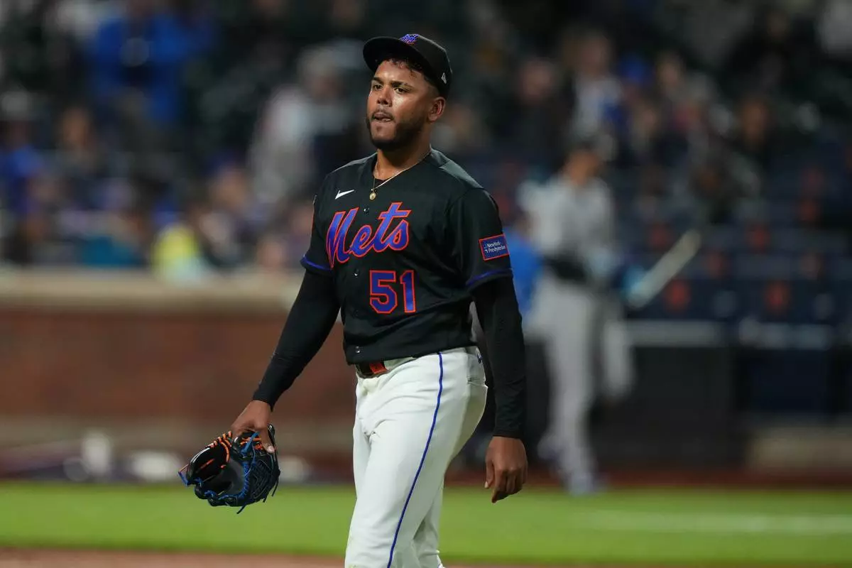 New York Mets pitcher Freddy Peralta (51) leaves during the sixth inning of a baseball game against the Colorado Rockies Friday, April 24, 2026, in New York. (AP Photo/Frank Franklin II)