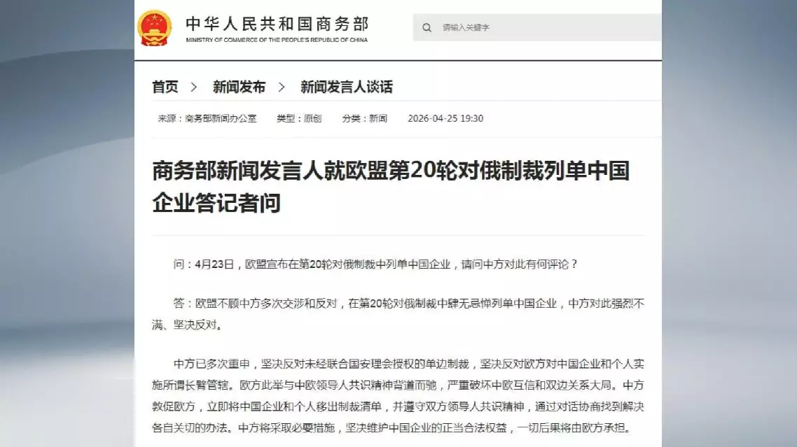 Despite China's repeated demarches and oppositions, the EU has included Chinese companies in its 20th package of sanctions against Russia, according to a spokesperson for the Ministry of Commerce.