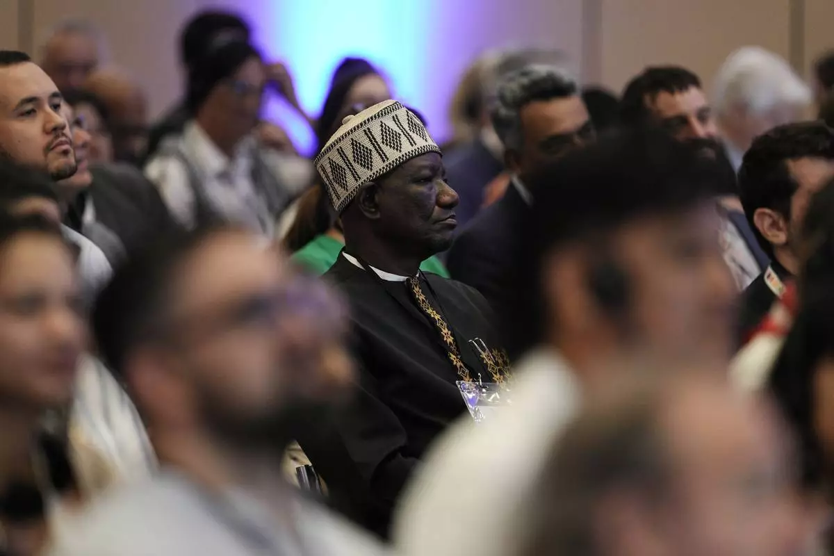 Attendees listen during a plenary session at a conference aimed at transitioning away from fossil fuels Tuesday, April 28, 2026, in Santa Marta, Colombia. (AP Photo/Ivan Valencia)