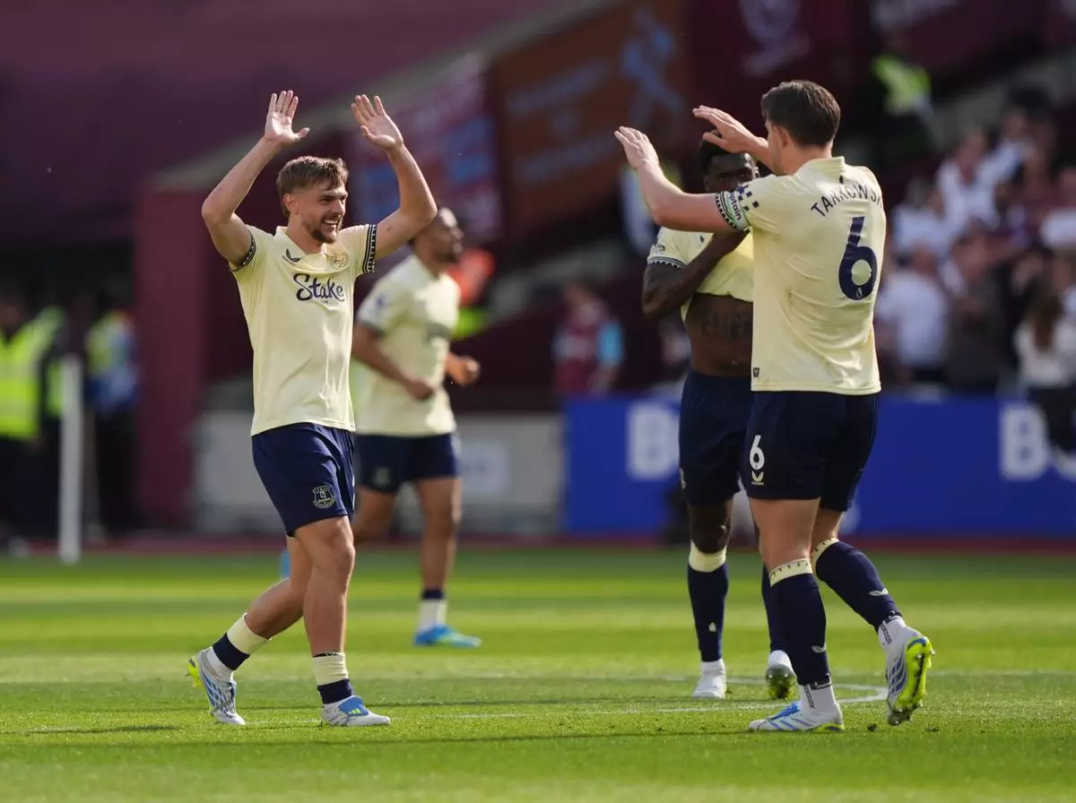 Everton's Kiernan Dewsbury-Hall, left, celebrates scoring during the English Premier League soccer match between West Ham United and Everton in London, Saturday April 25, 2026. (Jonathan Brady/PA via AP)