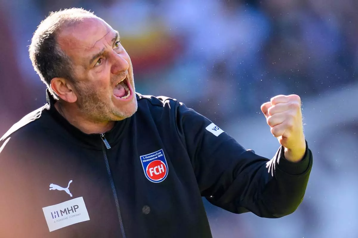 Heidenheim's head coach Frank Schmidt gestures during the German Bundesliga soccer match between 1. FC Heidenheim and 1. FC St. Pauli in Heidenheim, Germany, Saturday, April 25, 2026. (Tom Weller/dpa via AP)