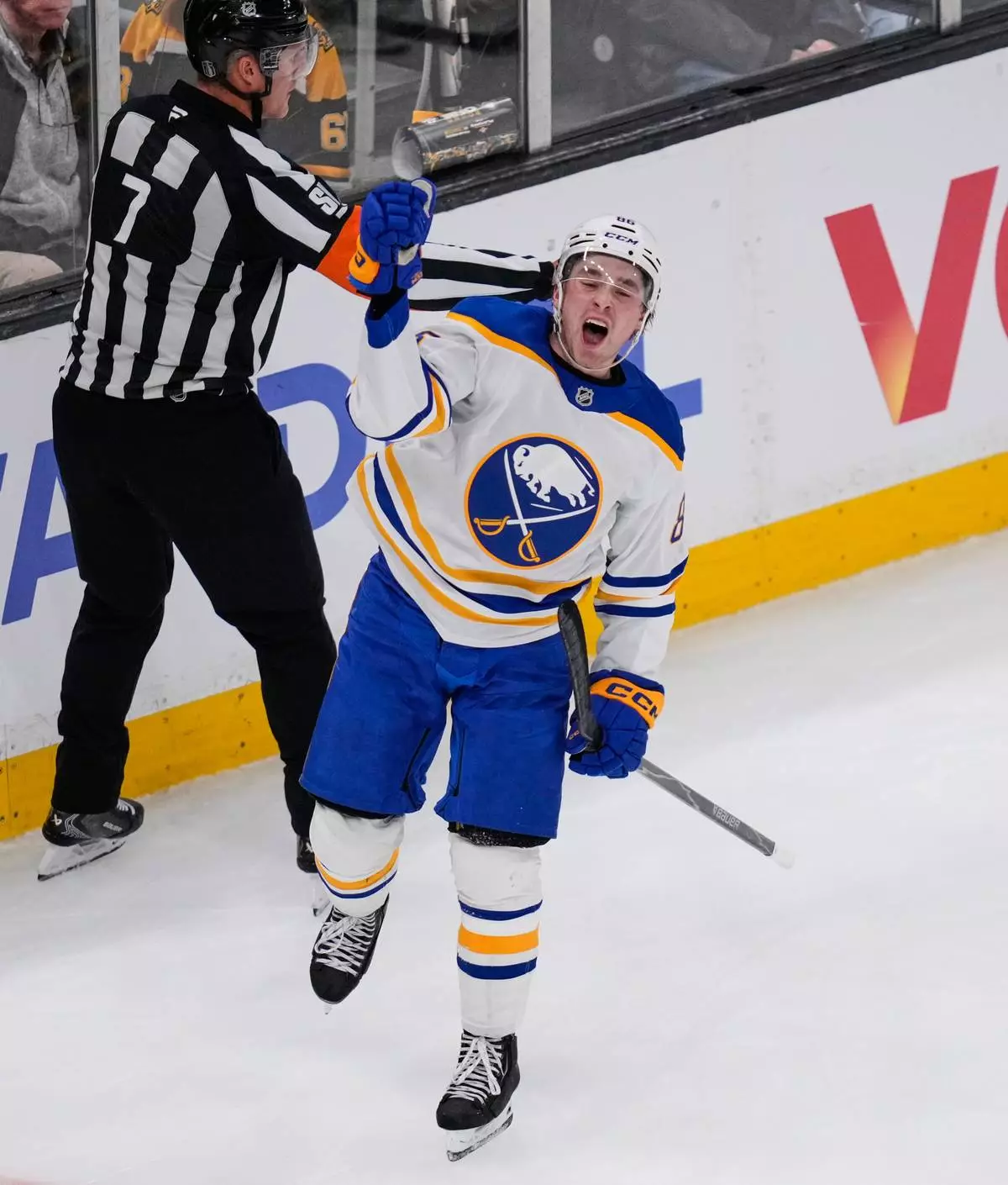 Buffalo Sabres center Noah Ostlund celebrates after his goal against the Boston Bruins during the third period in Game 3 of a first-round NHL hockey Stanley Cup playoff series, Thursday, April 23, 2026, in Boston. (AP Photo/Charles Krupa)