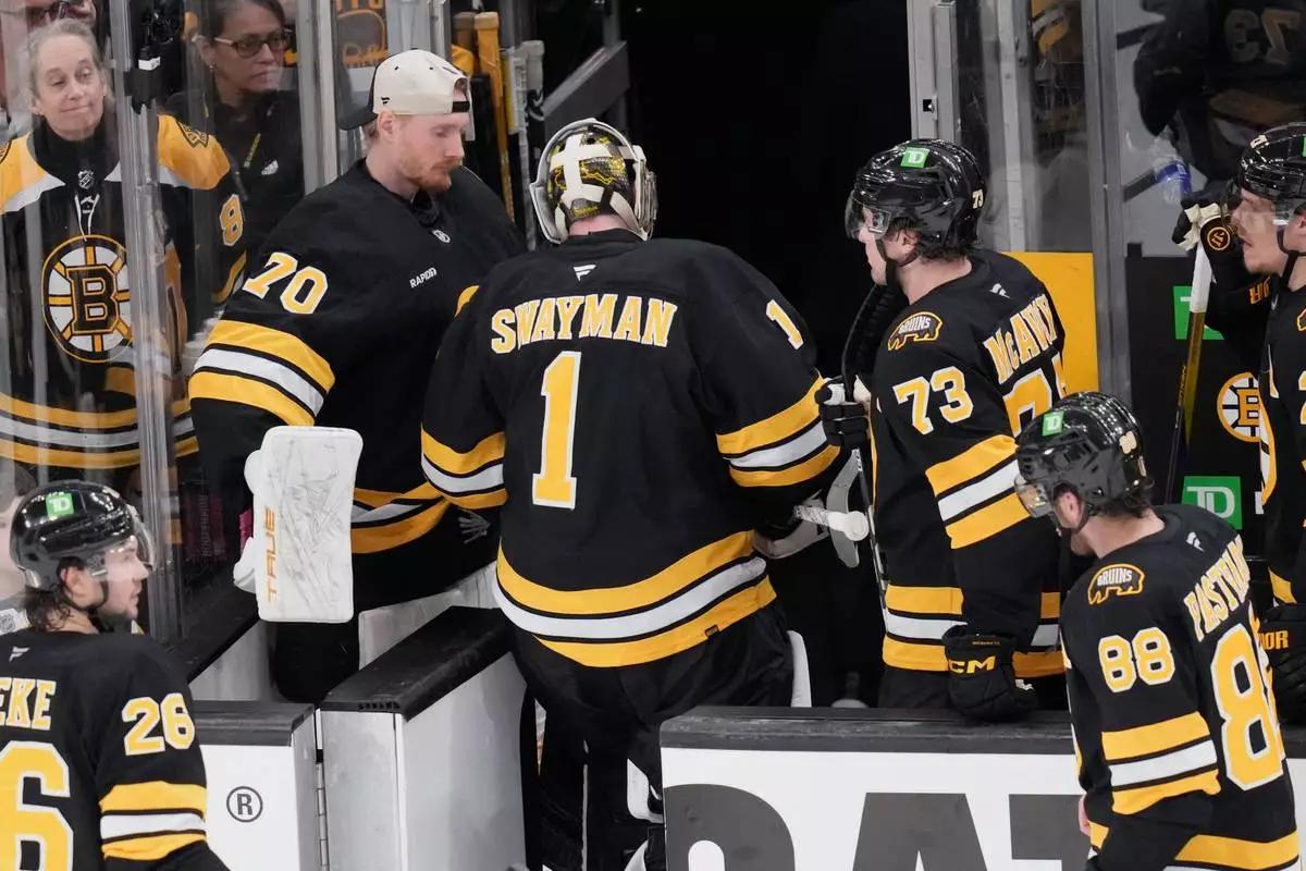 Boston Bruins goaltender Jeremy Swayman (1) heads to the locker room following a loss to the Buffalo Sabres in Game 3 of a first-round NHL hockey Stanley Cup playoff series, Thursday, April 23, 2026, in Boston. (AP Photo/Charles Krupa)