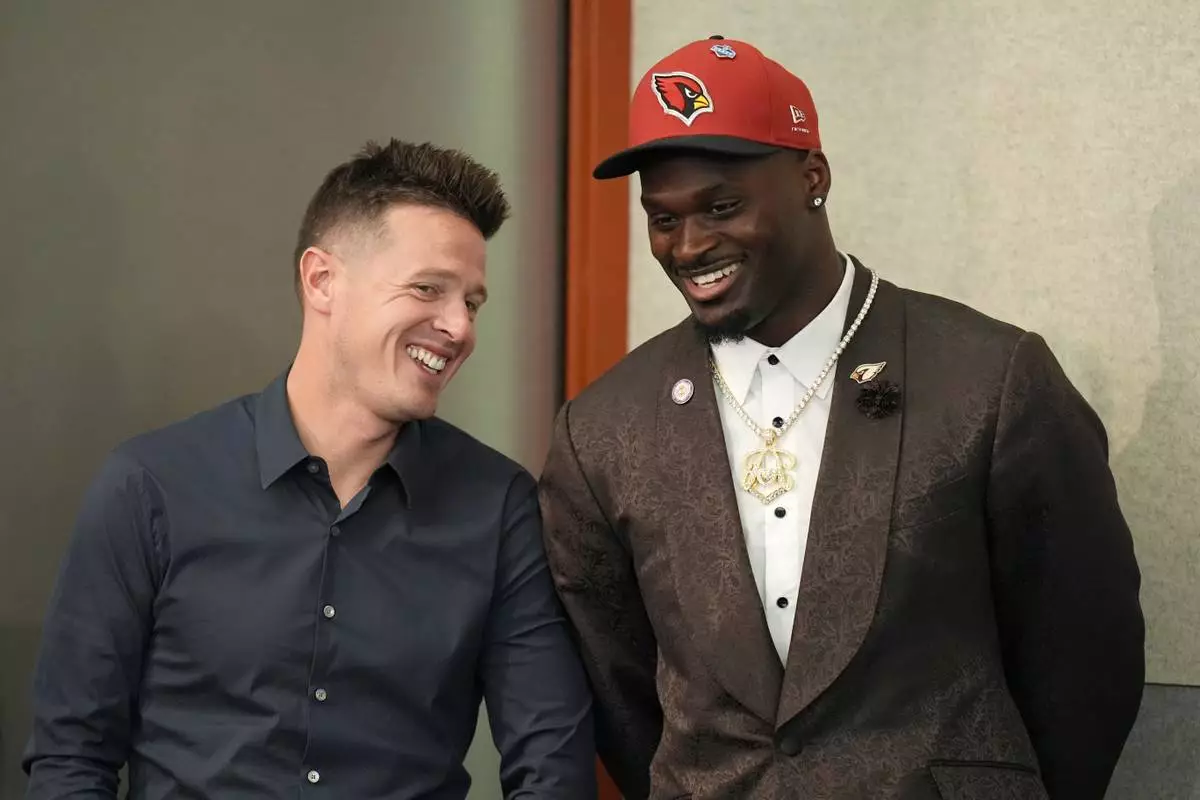Arizona Cardinals NFL football first round draft choice Jeremiyah Love, right, smiles along with Cardinals head coach Mike LaFleur before being introduced during a news conference, Friday, April 24, 2026, in Tempe, Ariz. (AP Photo/Ross D. Franklin)