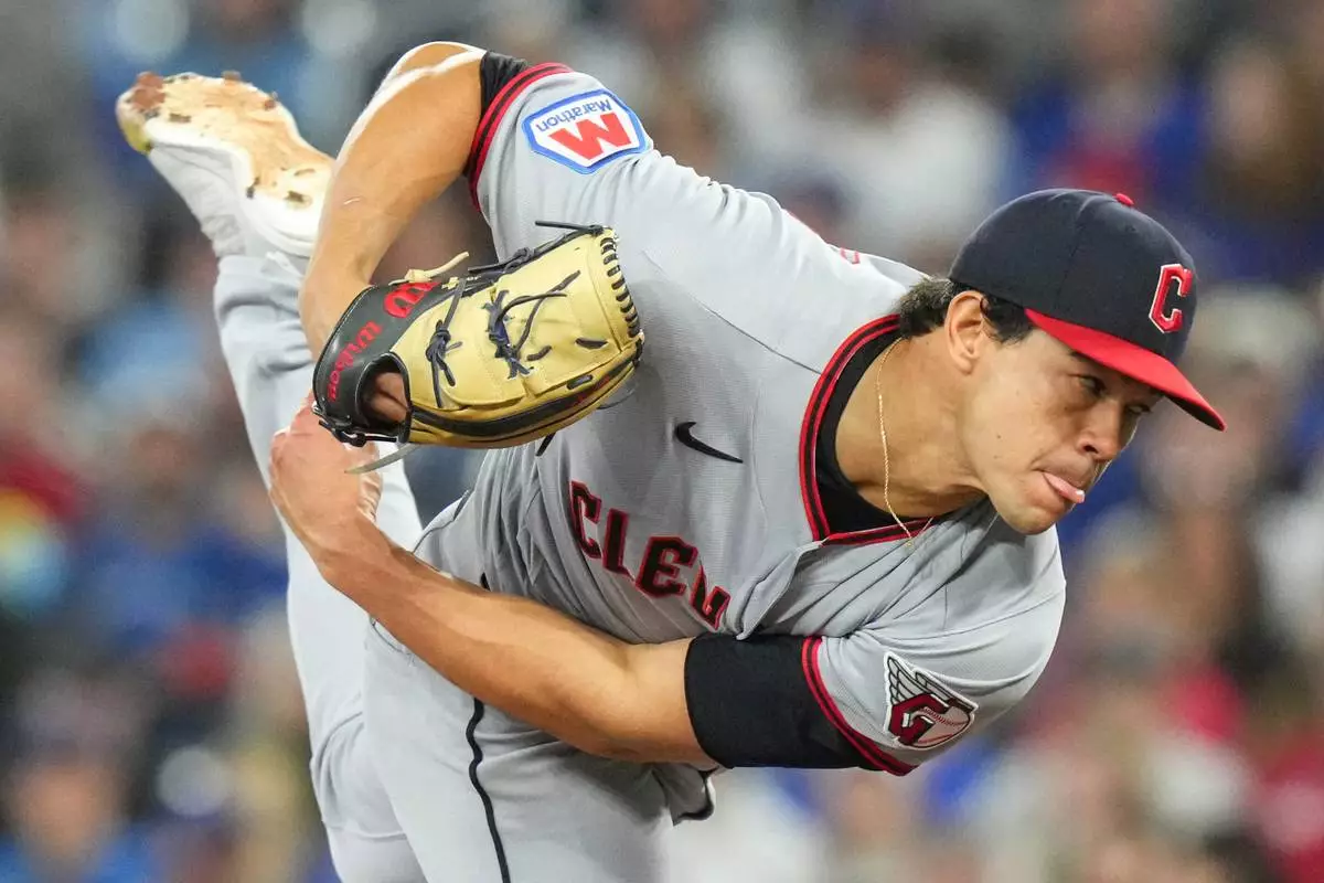 Cleveland Guardians pitcher Joey Cantillo (54) works against the Toronto Blue Jays during the first inning of a baseball game in Toronto, Saturday, April 25, 2026. (Chris Young/The Canadian Press via AP)