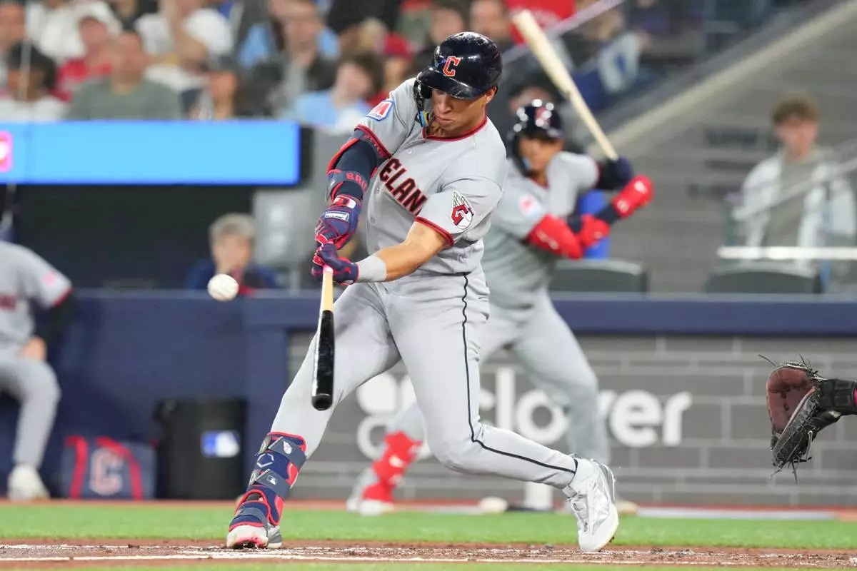 Cleveland Guardians' Juan Brito hits a double off Toronto Blue Jays pitcher Kevin Gausman during the third inning during the third inning of a baseball game in Toronto, Saturday, April 25, 2026. (Chris Young/The Canadian Press via AP)