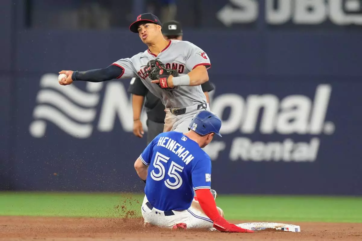 Cleveland Guardians second baseman Juan Brito (34) relays to first for a double play hit into Toronto Blue Jay's Myles Straw after forcing out Blue Jays' Tyler Heineman (55) at second during the third inning of a baseball game in Toronto, Saturday, April 25, 2026. (Chris Young/The Canadian Press via AP)