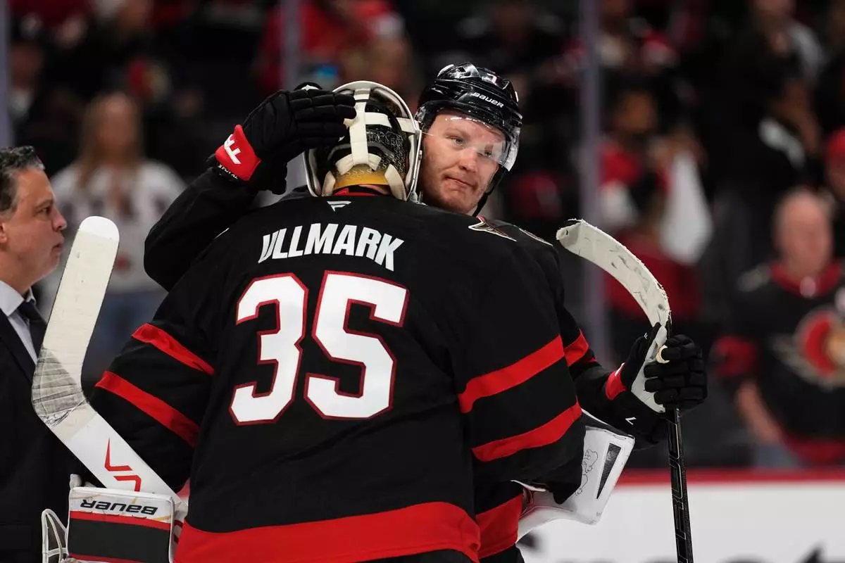 Ottawa Senators' Brady Tkachuk (7) embraces goaltender Linus Ullmark (35) after their team was eliminated by the Carolina Hurricanes after losing in Game 4 of a first-round NHL Stanley Cup playoff hockey series, Saturday, April 25, 2026, in Ottawa, Ontario. (Justin Tang/The Canadian Press via AP)